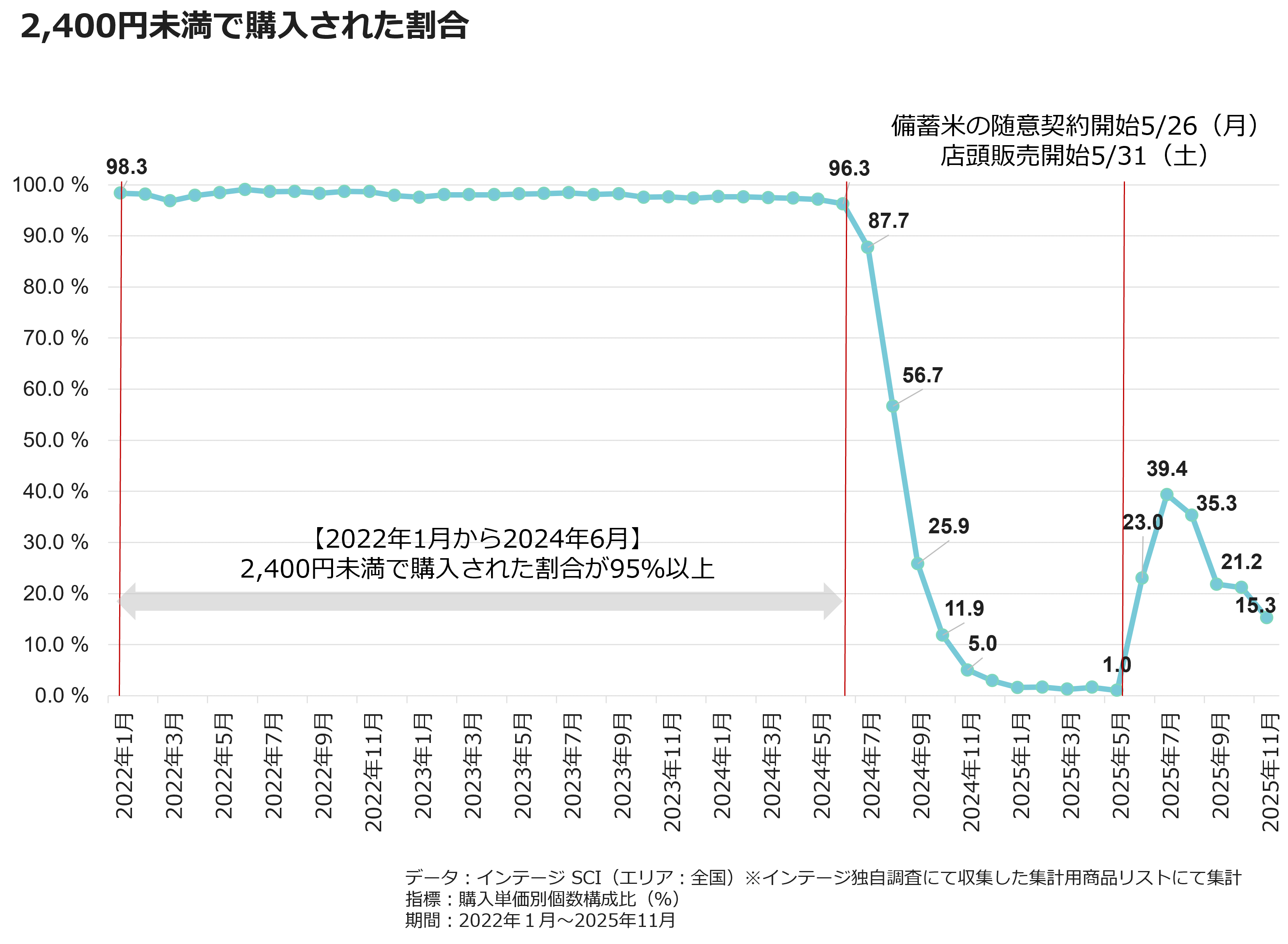 2025年5月末に随意契約備蓄米の店頭販売が開始されました。その翌月の2025年6月は、2,400円未満で購入された割合が23.0%に上昇し、2025年7月は39.4%、2025年8月は35.3%と、1年前の2024年8月以来はじめて35%を超える水準まで回復しました。しかしながら、随意契約備蓄米の販売が減り、新米が出てきた2025年9月以降は21.2%以下と、再び下落しました。