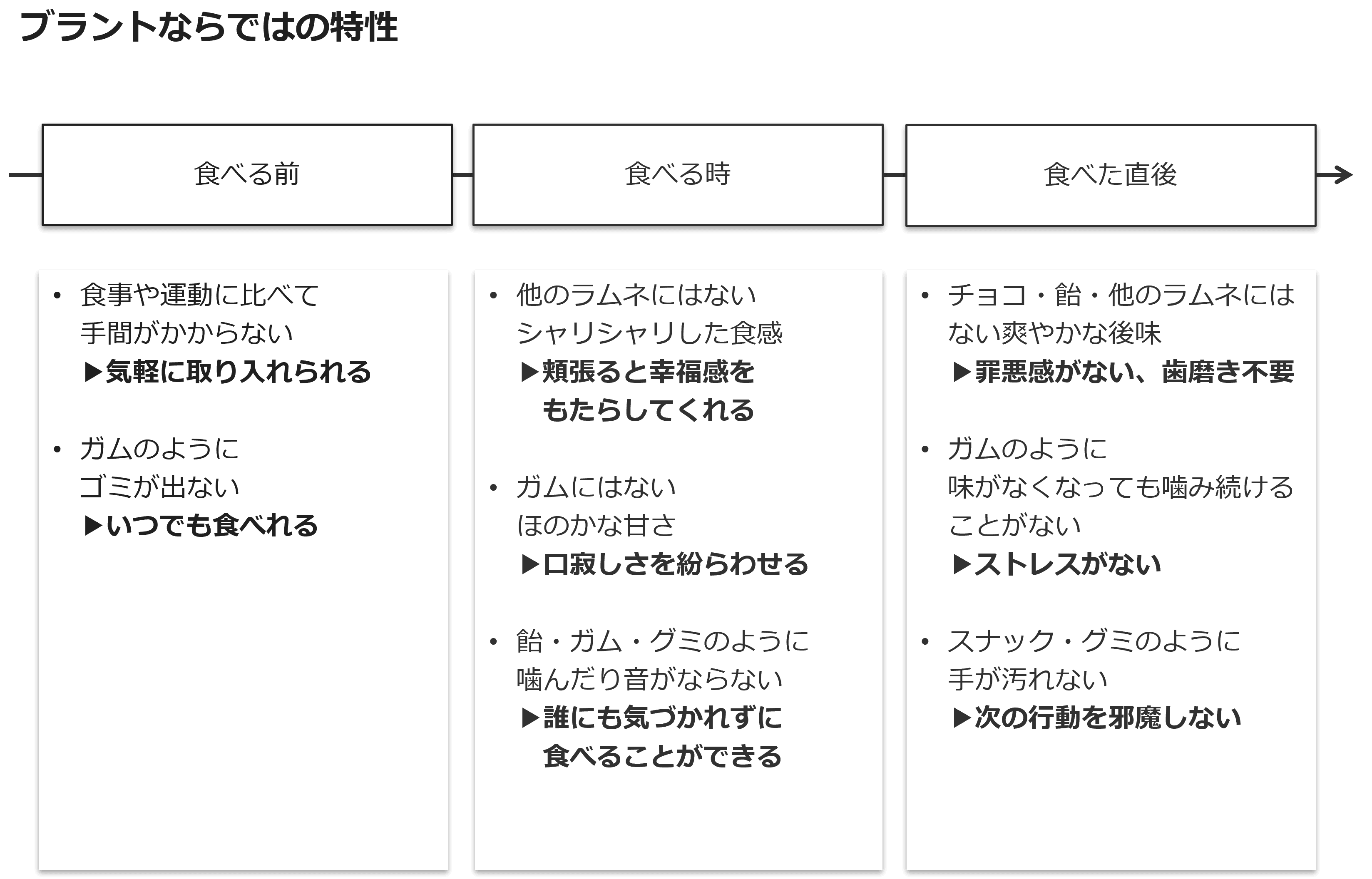 また、食感や味など食べてすぐに五感に働きかけられる報酬と、摩擦(ストレス、手間、障壁)を取り除き、スムーズな行動を実現するという食べる前後の物理的・精神的なフリクションレスが、ラムネである理由・この商品である理由となっていることがわかりました。